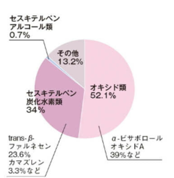 この精油の有効成分カマズレンは、植物中には存在しない。花になるマトリシンが加熱などによって分解され、蒸留中に生じる。